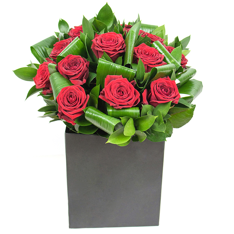 Our timeless bouquet features beautiful red roses complemented by elegant aspidistra leaves and ruscus. This unique arrangement brings grace and style to any setting.