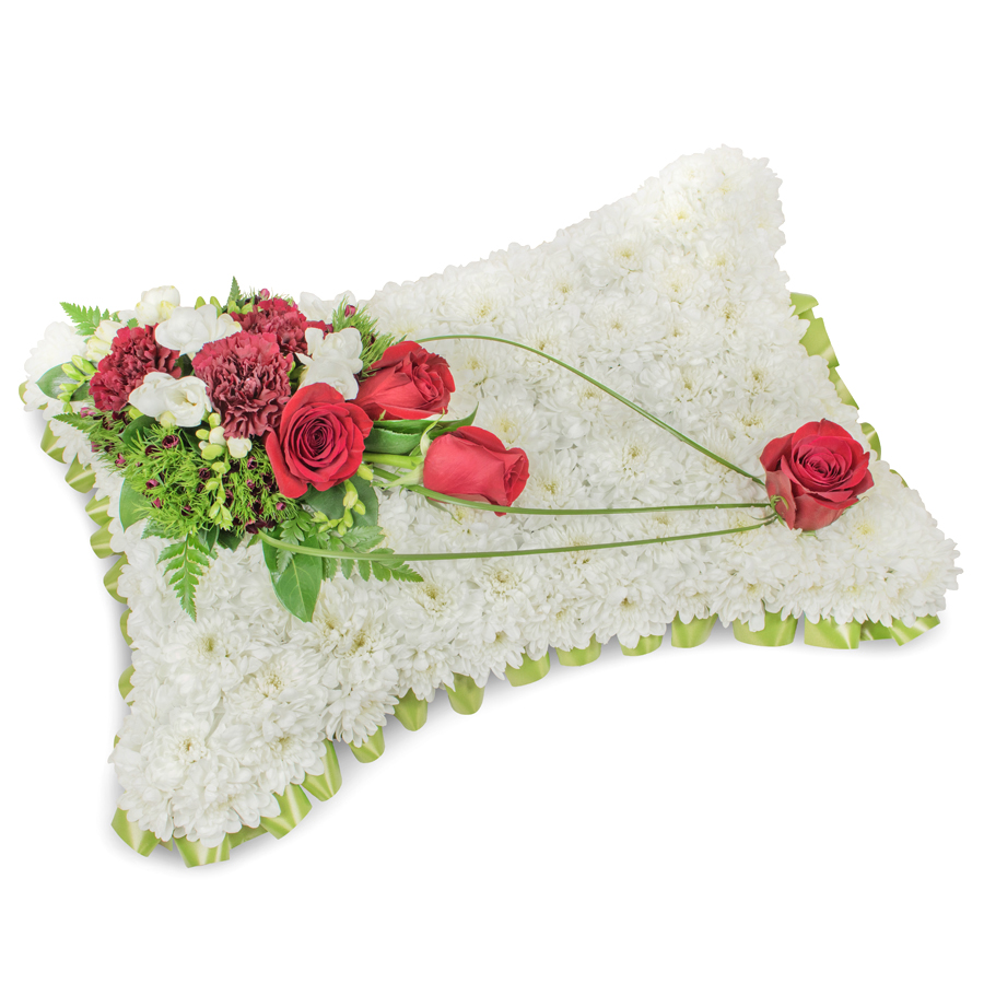 Convey your heartfelt condolences with our elegantly designed bouquet featuring white chrysanthemums, vivid red roses, aromatic white freesias, bold dark red carnations, delicate dianthus, and bear grass.